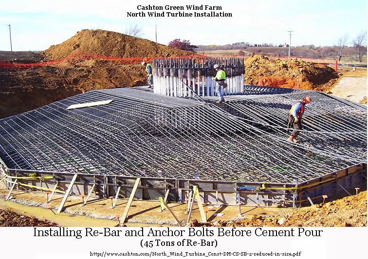 When you see these things from a distance in the countryside, it's hard to realize how truly gigantic they are. Weber gives the following statistics for just one 2.5 MWe wind turbine: tower height - 100 meters (328 feet); total height to top of blade - 485 feet; total weight - 2000 tons (!), mostly of steel and concrete. (Source: Kansas Energy Information Network here.) Here's a picture of the base of a 2.5 MWe turbine under construction, with some men in the picture to give a sense of the scale. That's about 45 tons of steel re-bar: