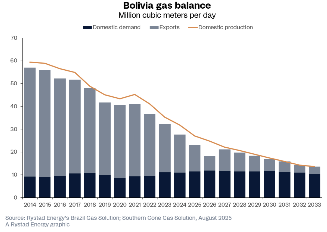 So the Socialists have had another five years to fix the problems and get their program to work. How has that gone? The key industry in Bolivia for funding the Socialist dream has been natural gas production. OilPrice.com had an article on August 28, with data sourced to Rystad Energy. The chart includes data from 2014 to 2025, and projections to 2033: